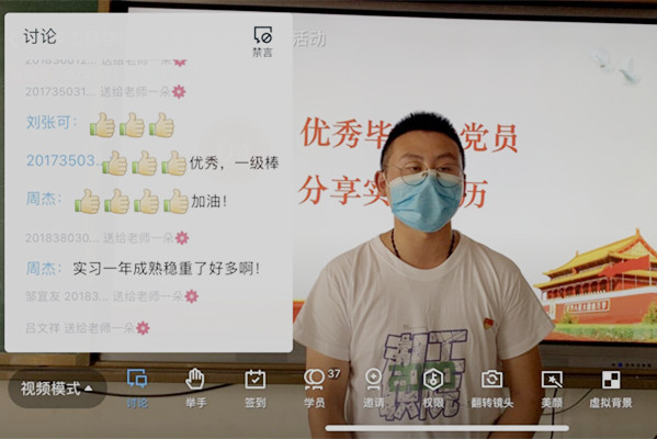 新闻网讯(通讯员 玉声)“当企业加紧生产要求连上两班时,有的人坚持不了选择离开,我也有想打退堂鼓的念头,但想到作为一名共产党员应当迎难而上,于是咬咬牙就坚持了下来……”,在东风小康实习的毕业生党员田金超与大家分享实习经历时感慨地说。6月19日下午,米兰milan官方网站学生党支部通过腾讯课堂直播开展了一场别开生面的“线上+线下”主题党日活动。米兰milan官方网站学生党支部书记曲杉主持此次主题党日活动。党总支书记张玲、副书记梁军萍、学生党小组组长柳海涛以及毕业生党员代表在5307参会,37名非毕业生班学生党员和入党积极分子以观看直播方式参加活动。