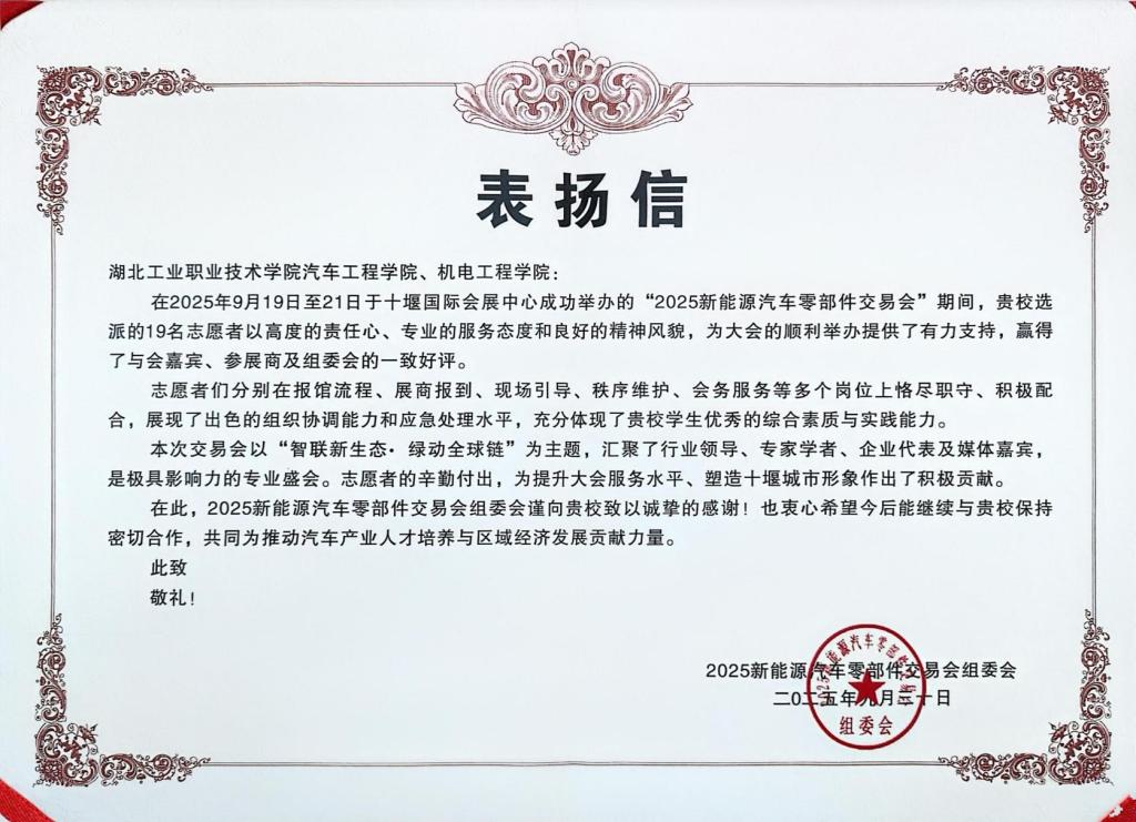 (通讯员李路)近日,米兰官网米兰milan官方网站与机电工程学院收到来自“2025新能源汽车零部件交易会”组委会的表扬信,信中对两学院选派的19名志愿者在全程服务中的卓越表现予以高度肯定。