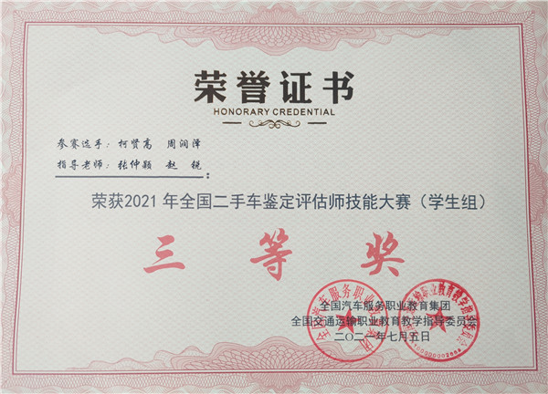 新闻网讯(通讯员 张玲 张仲颖)7月4日,2021年全国二手车鉴定评估师技能大赛(学生组)在浙江交通职业技术学院圆满闭幕。经过二手车鉴定评估实操和二手车理论考试两轮的激烈角逐,米兰官网米兰milan官方网站2019级“一汽-大众订单班”柯贤高、周润泽同学克服备赛时间短、天气炎热、实训车辆缺乏等困难,凭借扎实的基本功在众多院校选手中脱颖而出,获得全国三等奖的好成绩。